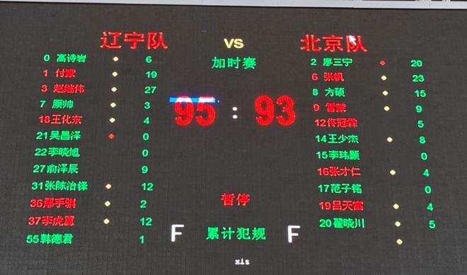 中场休息回来,张帆继续发力连得5分,方硕和廖三宁也连续打出反击,北京队将分差缩小到只剩下1分。不过接下来北京队再次陷入得分荒,赵继伟里突外投,李虎翼三分球弹无虚发,高诗岩和付豪也都有得分进账,辽宁队打出一波16-4的小高潮将优势扩大到两位数,并以70-60结束了第三节比赛。末节比赛决战,北京队持续追分,张帆和雷蒙的三分球帮助球队将分差追到个位数。最后阶段比赛打得比较乱,北京队连续打出攻防转换将比分追至86-86平,高诗岩绝杀球不中,比赛进入加时。加时赛阶段,两队依旧打得难解难分,张陈治锋和李虎翼都有得分进账,帮助球队取得领先。最后时刻张帆绝杀三分球不中,辽宁队最终以95-93惊险战胜了北京队。