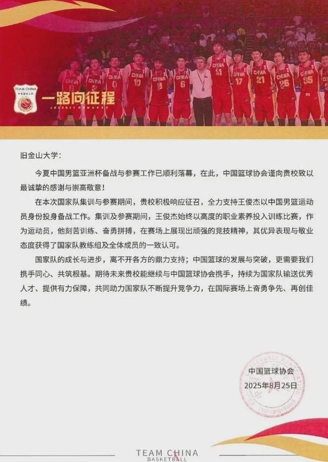 值得一提的是,今年8月末中国篮协向旧金山大学致信,主要是感谢他们支持王俊杰出战亚洲杯,并期待未来能够继续携手共进。