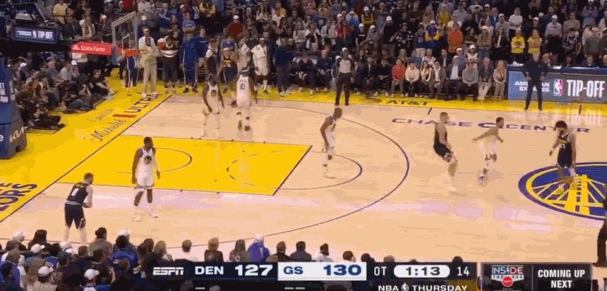 加时赛最后1分钟,勇士手握3分领先。掘金祭出约穆挡拆企图让约基奇单打库里,站在底角的库明加主动提上换防,同时指挥库里去底角,库明加最终干扰了约基奇出手,为后续巴特勒命中三分奠定基础。