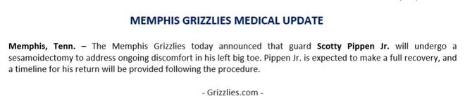 灰熊队官方宣布,后卫小斯科蒂-皮蓬将因左脚大脚趾受伤接受手术,据消息人士透露,他将在12周后重新接受评估。灰熊队表示,小皮蓬将接受籽骨切除术以处理他们所说的“持续不适”,预计他将完全康复。