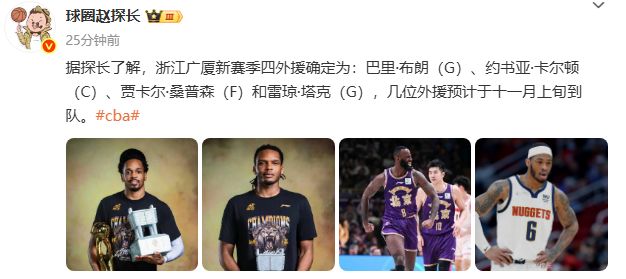 球圈赵探长:据探长了解,浙江广厦新赛季四外援确定为:巴里·布朗(G)、约书亚·卡尔顿(C)、贾卡尔·桑普森(F)和雷琼·塔克(G),几位外援预计于十一月上旬到队。