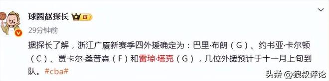 北京时间10月20日,根据媒体人赵探长的报道,浙江广厦新赛季四外援确定为:巴里·布朗(G)、约书亚·卡尔顿(C)、贾卡尔·桑普森(F)和雷琼·塔克(G),几位外援预计于十一月上旬到队。