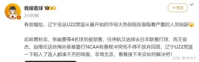 黄秋实、张峻豪被禁赛三年后,辽篮再一次遭到打击,根据多位知情人士透露,为了更好的备战NCAA联赛,王俊杰和赵维伦目前已经决定放弃回国征战全运会了。要知道,在今年全运会上,U22组级别的比赛,辽篮本该是第一争冠大热门球队,可随着四大主力球员缺席,辽宁队一下子从争冠大热门变成连12人大名单都凑不齐的球队,确实令人倍感惋惜。当然,广东队则极有可能会成为最大受益者。