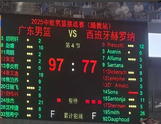 末节比赛已经提前失去胜负悬念,双方开启练兵模式,最终广东全运男篮97-77大胜西班牙赫罗纳男篮豪取5连胜。