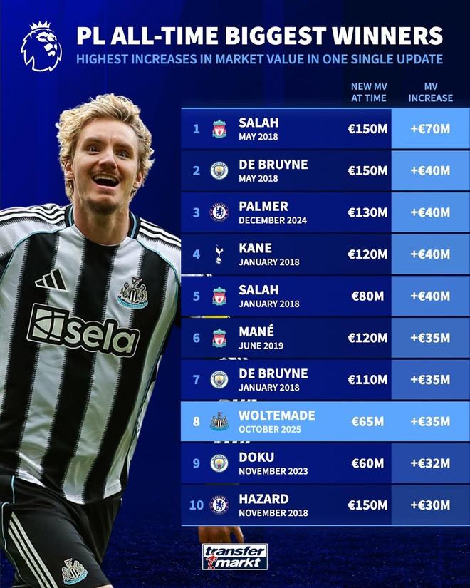 北京时间10月20日,德国转会市场列出了英超球员的历史单次身价涨幅榜,其中沃尔特马德以3500万欧元位居第8,萨拉赫仍然居首。