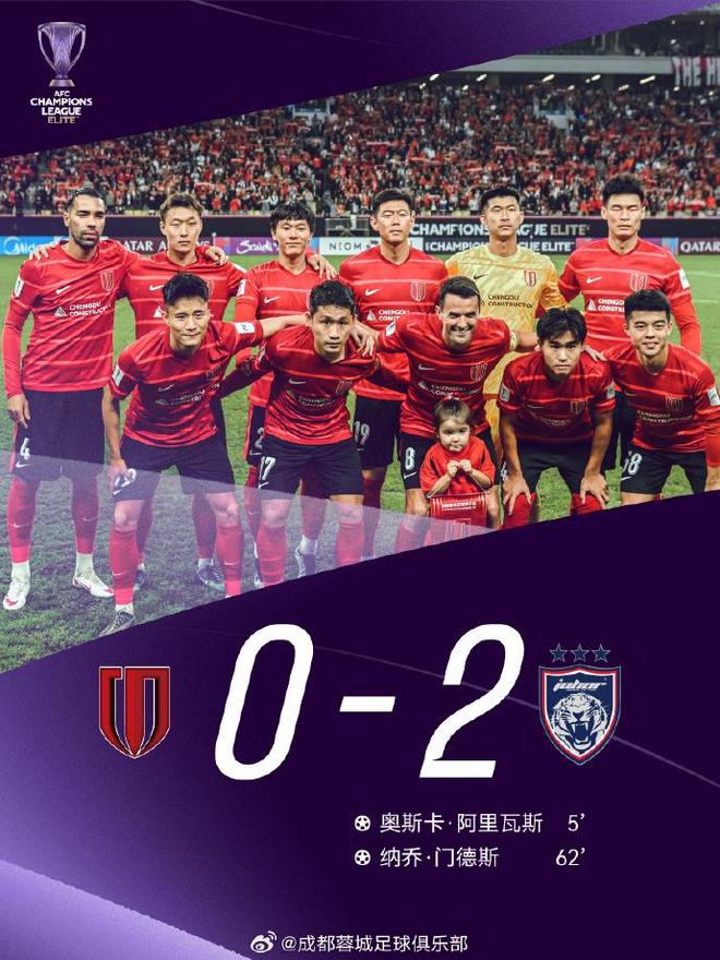 蓉城官方:“今晚,2025/26亚冠精英联赛第3轮,成都蓉城主场迎战柔佛DT。此役成都蓉城进行了一定轮换。上半场开场不久,对手破门取得领先,成都蓉城虽然控球占优,但未能获得较好的射门机会,半场比分0-1。下半场对方再入一球。最终,成都蓉城0-2柔佛DT。”