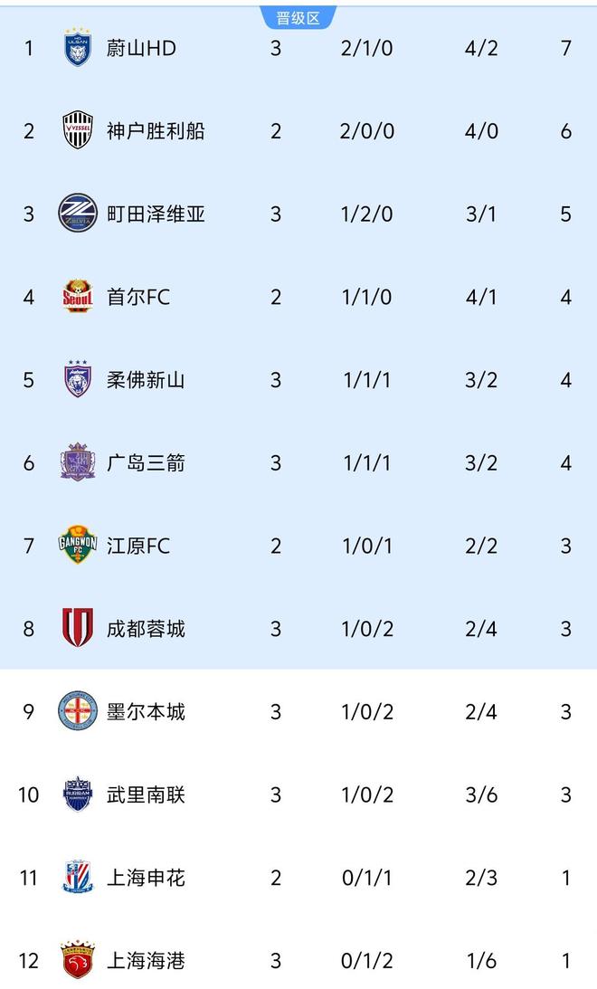 最新积分榜方面,2支中超球队输球之后排名再次下跌。上港成为本赛季首支3轮不胜的球队,在墨尔本城拿到首胜之后成为新的垫底球队。成都蓉城与墨尔本城、武里南联同积3分,凭借净胜球优势暂时排在第8。2支3轮保持不败的球队,蔚山HD积7分,在先赛一场的情况下暂时登顶积分榜;町田泽维亚则积5分跃升至第3。