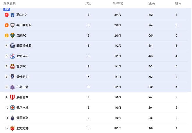 三轮战罢,蔚山HD2胜1平排在东亚区第一,神户胜利船和江原FC均为2胜1负暂列第二、第三,町田泽维亚1胜2平排在第四,上海申花、首尔FC、柔佛新山、广岛三箭均为1胜1平1负分列第五到第八位,成都蓉城、墨尔本城、武里南联均为1胜2负分列第九到第十一位,上海海港1平2负垫底。