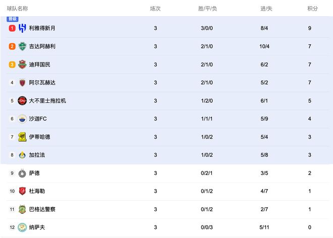 三轮战罢,利雅得新月三战全胜暂列西亚区榜首,吉达国民、迪拜青年国民、阿布扎比统一均为2胜1平紧随其后分列二、三、四位,大不里士拖拉机1胜2平排名第五,沙迦1胜1平1负排在第六,吉达联合、加拉法体育均为1胜2负分边排在第七、第八位,萨德2平1负排在第九,杜海勒、巴格达警察1平2负排在第十、第十一位,纳萨夫三连败垫底。